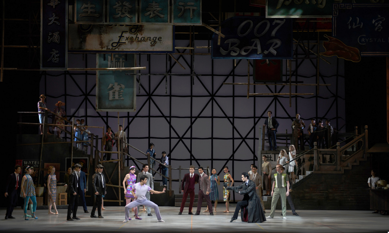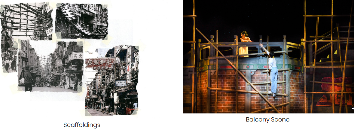 네온 간판이 빛나는 거리, 대나무 비계, 좁고 얽힌 골목길 구조물이 무대 위에서 유연하게 변주됩니다. 전통적인 발코니 장면조차 이 구조물 속에서 새롭게 연출되어, 당시 도시의 생생한 공기와 비극적 서사가 어우러집니다.