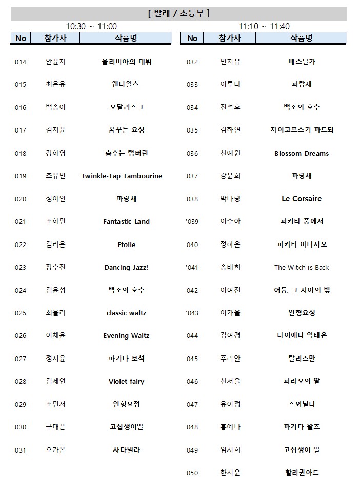 참가자들은 본인 순서를 확인하시고, 입실 및 준비 시간을 꼭 지켜주세요.
